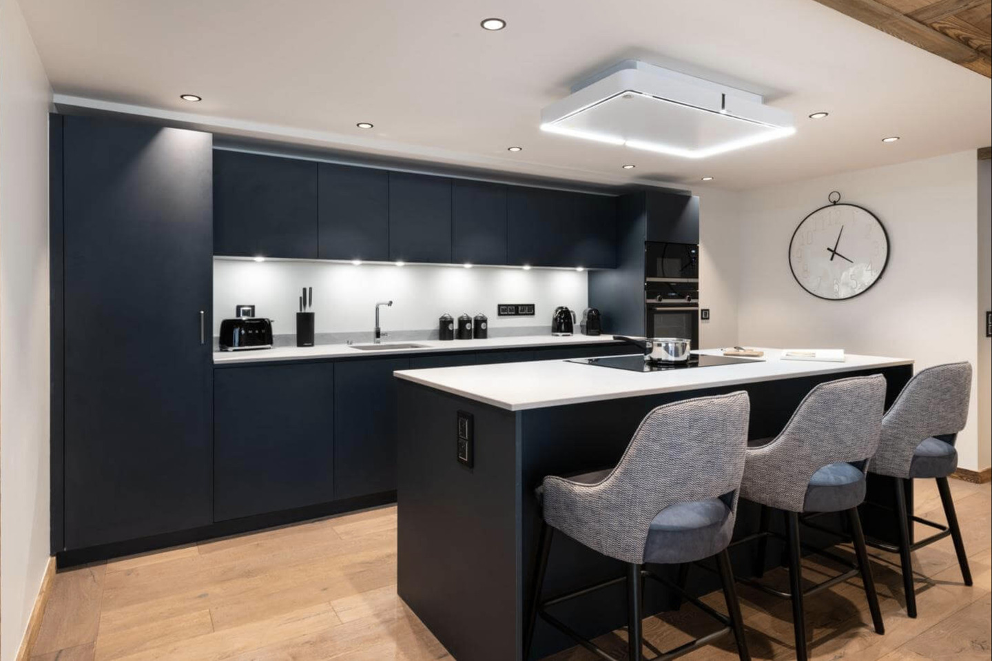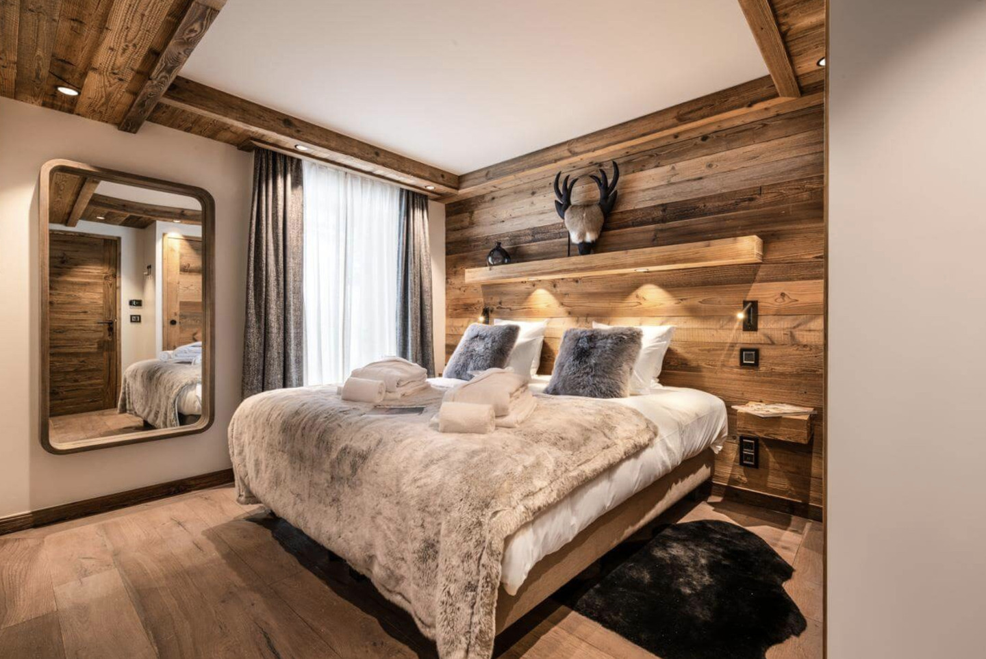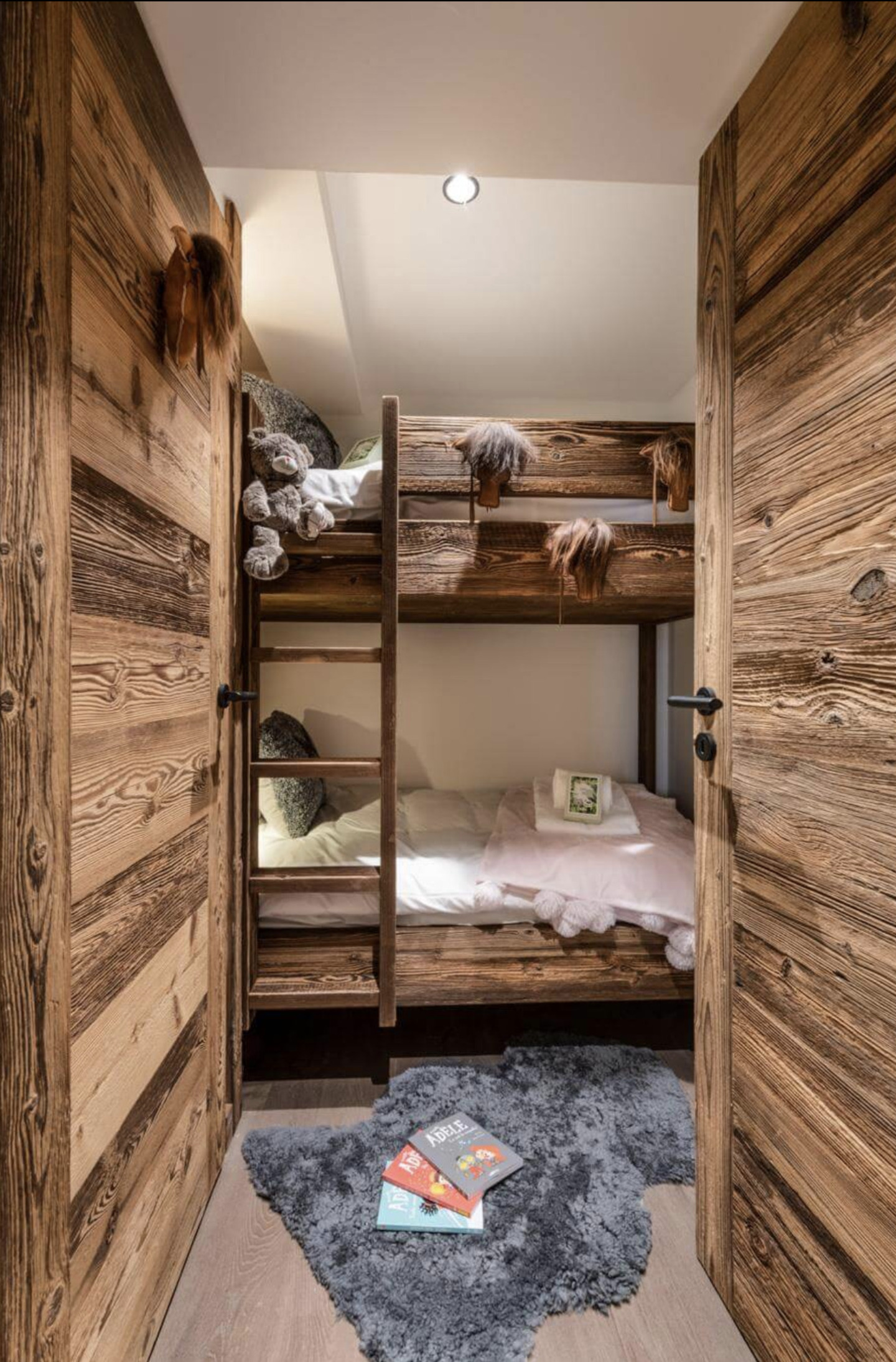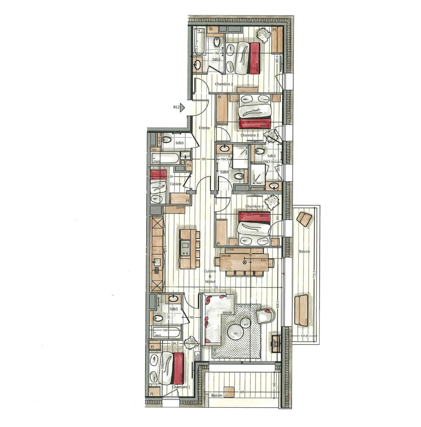 В апартаменте четыре спальни с двуспальными кроватями и одна «кабинная» комната с двухъярусной кроватью, все с собственными ванными комнатами, что гарантирует конфиденциальность и комфорт всех гостей. Светлая гостиная-столовая с камином выходит на меблированный балкон, идеальный для наслаждения альпийскими пейзажами.