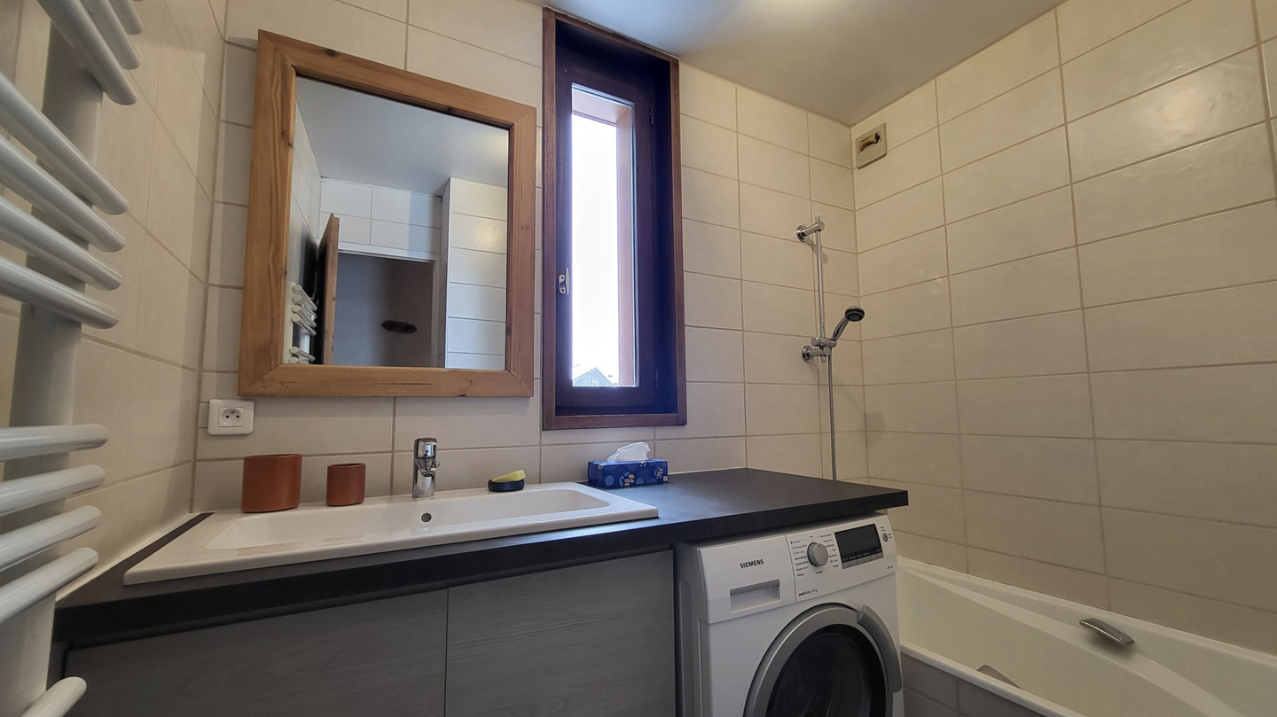 Bathrooms: One main bathroom with a bathtub and washing machine, plus a separate toilet.