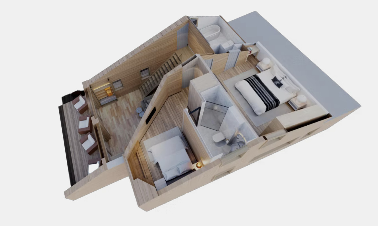 Level 1: Luxurious Bedrooms with Outdoor Access This level hosts three exquisite bedrooms. Bedroom 1 features a Queen-size double bed, balcony, dressing room, TV, and en-suite shower room with hairdryer, towel dryer, double sinks, and toilet. Bedroom 2 offers a Queen-size double bed, balcony, dressing room, TV, and en-suite shower room with hairdryer, towel dryer, single sink, and toilet. Bedroom 3 has a Queen-size double bed, balcony, dressing room, TV, and en-suite shower room with hairdryer, towel dryer, and single sink. A separate toilet adds convenience.