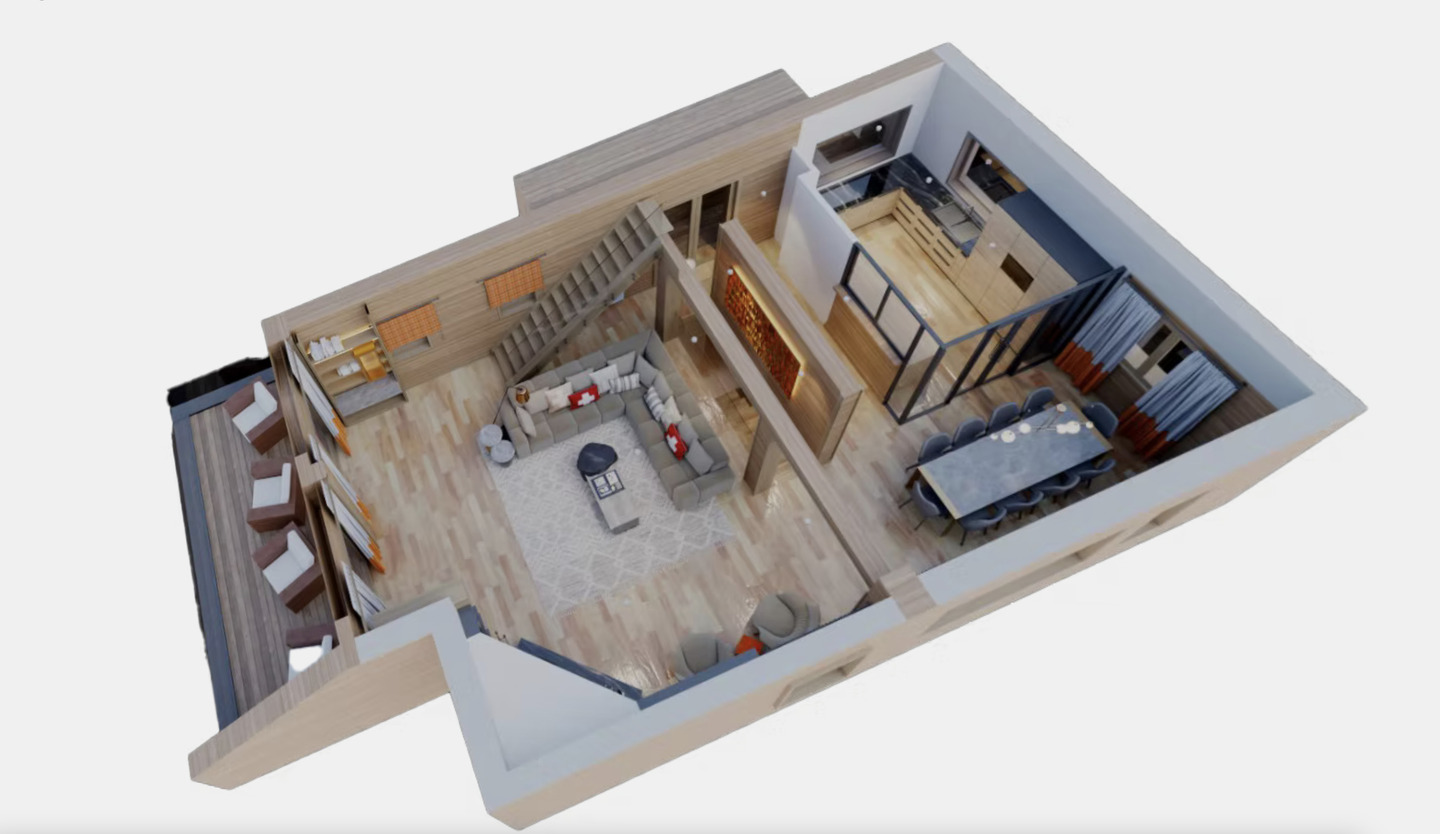 Level 2: The Heart of the Home with Views The second floor is the social hub, with a lounge area equipped with two comfortable sofas and two armchairs by the window, ideal for enjoying the scenery. A cozy fireplace creates a warm ambiance, and the fully equipped kitchen invites you to prepare delicious meals. From its two balconies, you can enjoy stunning mountain views.