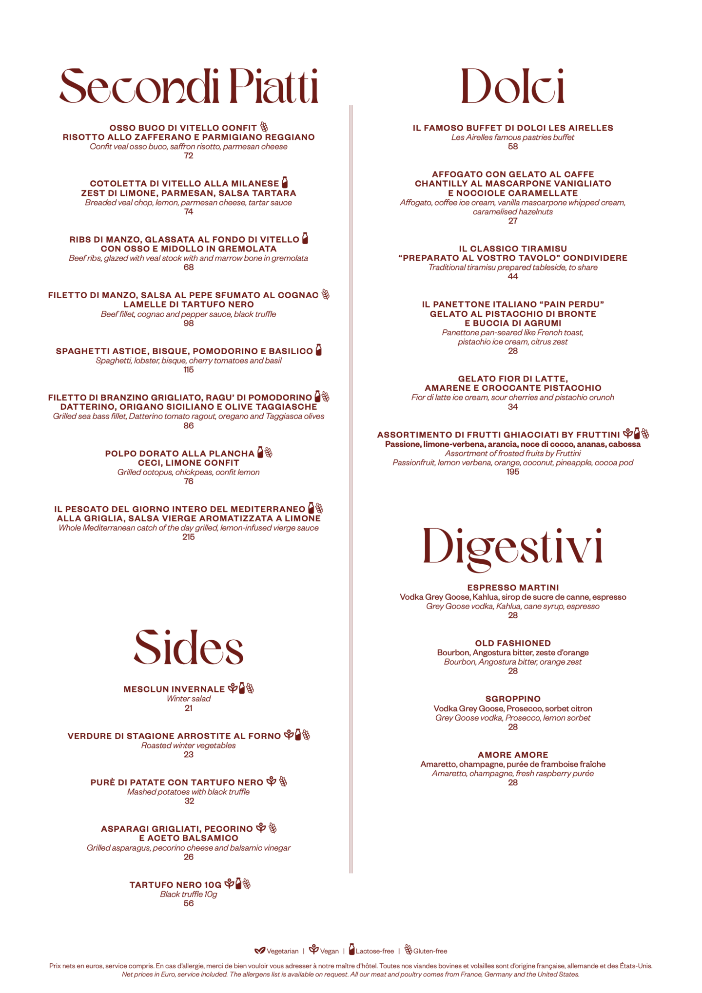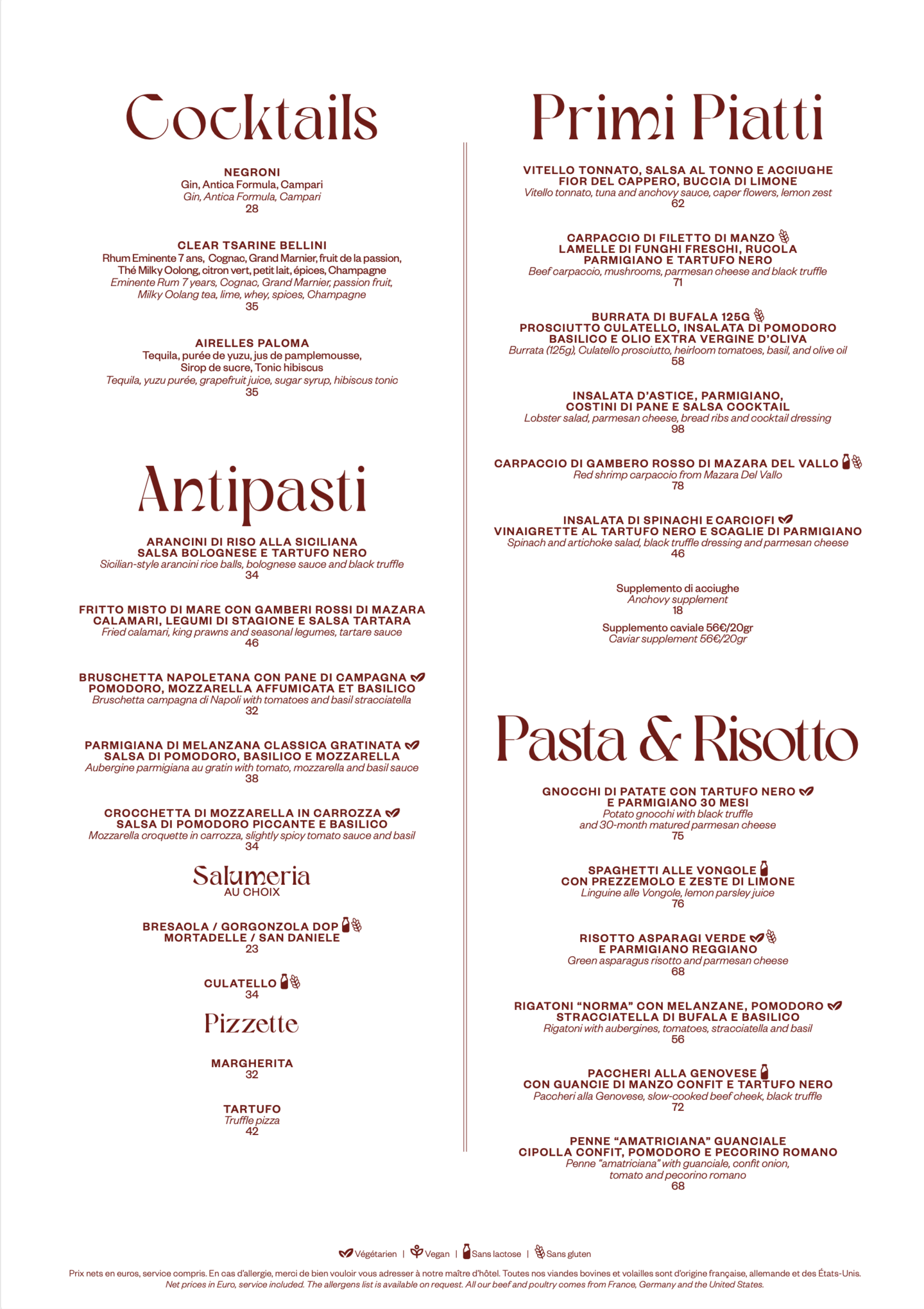 L'expérience culinaire débute par une sélection d'antipasti exquis, qui peuvent inclure des délices comme les arancini au safran et au thon, les langoustines grillées à la moutarde et au citron, ou l'aubergine à la parmigiana classique. S'ensuivent des plats principaux généreux, mettant en avant des options telles que les gnocchis à la truffe ou les tagliolini fondants au homard. Pour une finale parfaite, le tiramisu classique est proposé, ou notre glace maison à la vanille torréfiée, accompagnée de chantilly, de chocolat fondu et de noisettes caramélisées. Une sélection méticuleuse de vins français et italiens complète et sublime chaque plat.