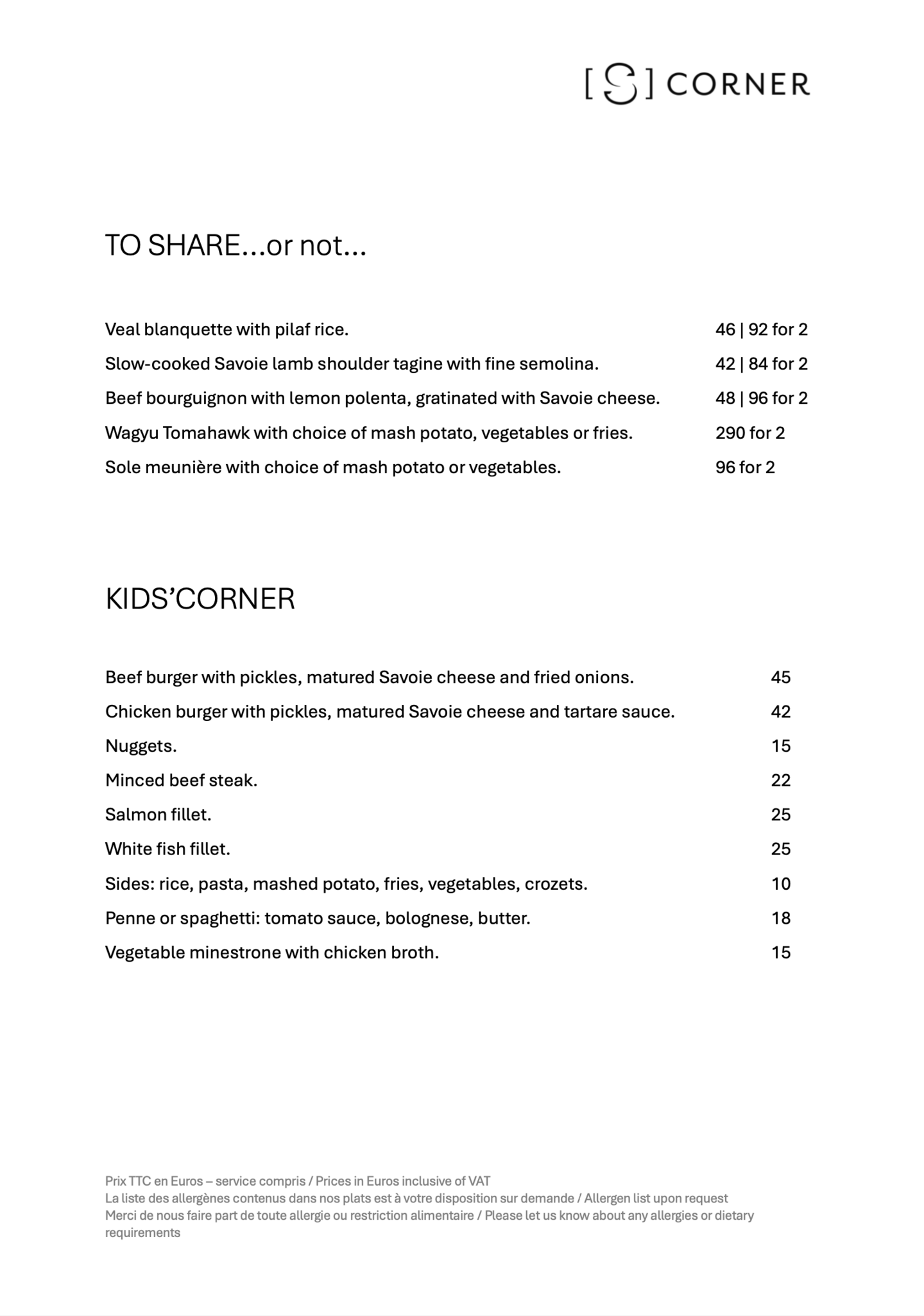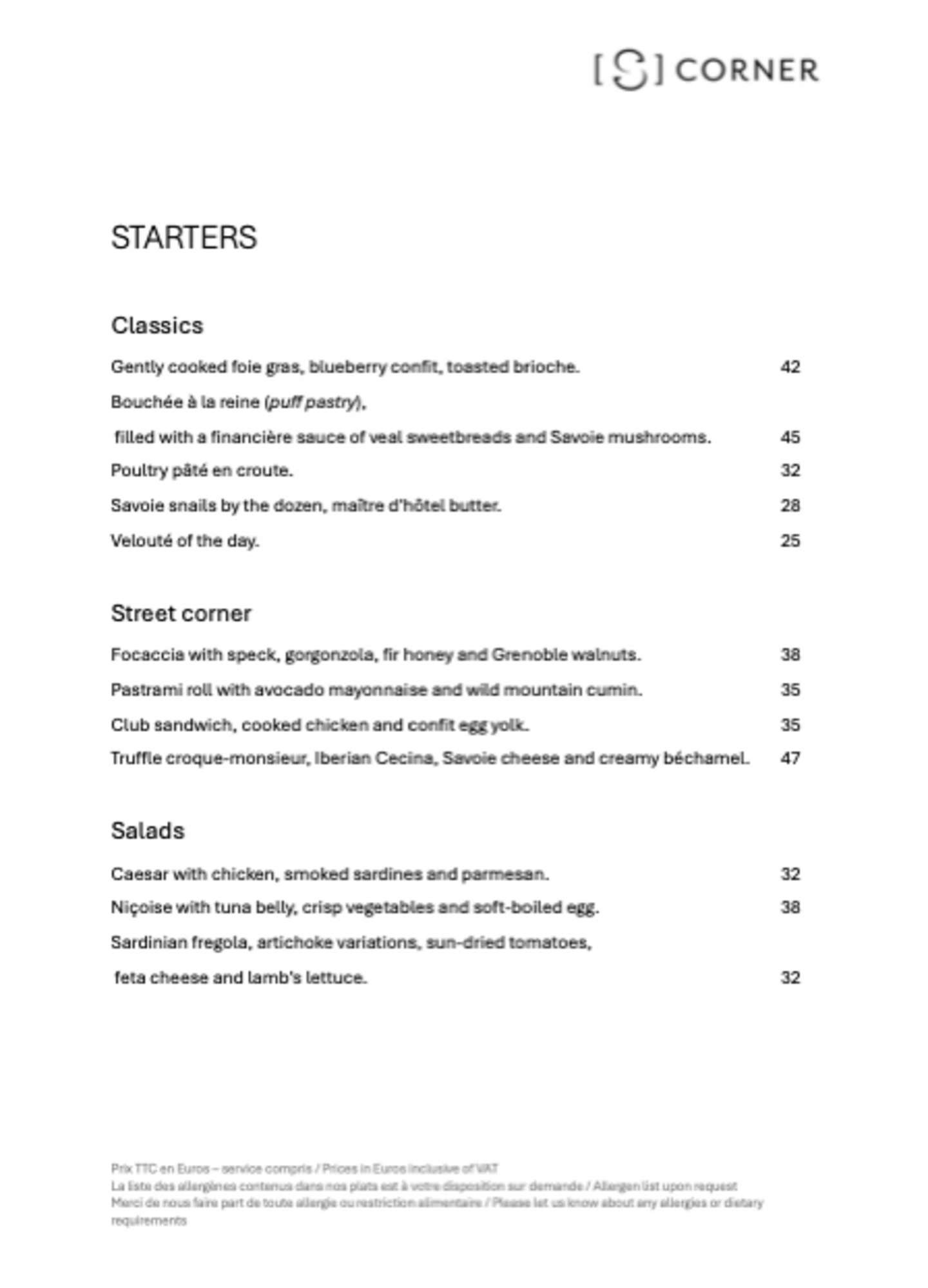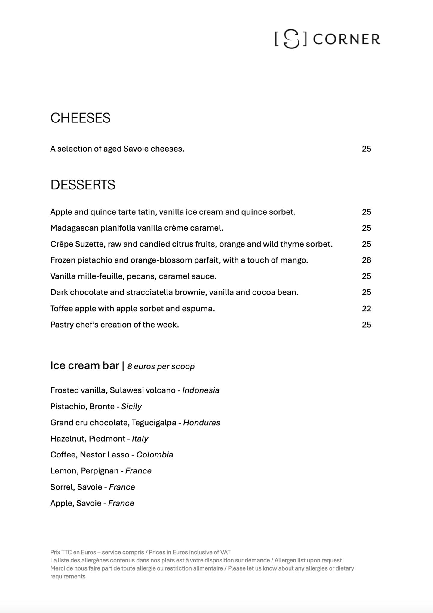 For the grand finale, the sweet selection offers a nostalgic return to childhood flavours: from Churros with hazelnut praline and a revisited Pomme d'amour (toffee apple), to the Millefeuille and a dedicated ice cream bar. A selection of desserts designed to be enjoyed to the fullest.