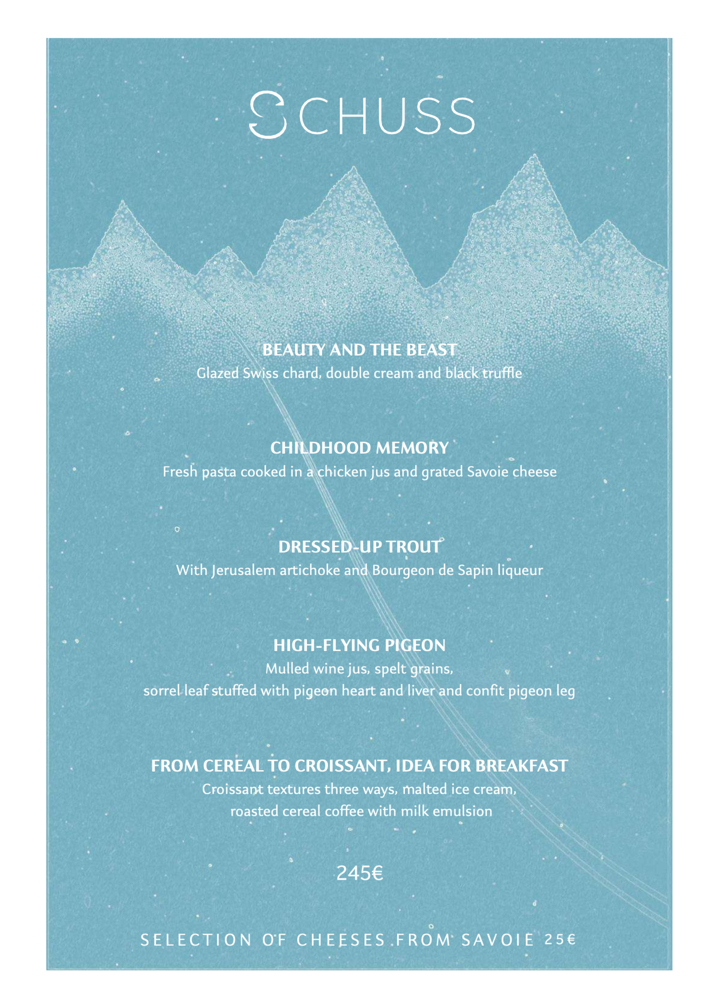 Chef Thomas Prod'homme brings simple flavours up to date. For starters: Savoy chard, black truffle served thick, double cream; for the main course: Arctic char, celery in a Vongole-style pastry, beurre blanc with saffron from the Massif des Bauges and for dessert: a Savoy pear cooked in honey, Grenoble walnuts, alpine milk texture and iced pear and ginger juice.