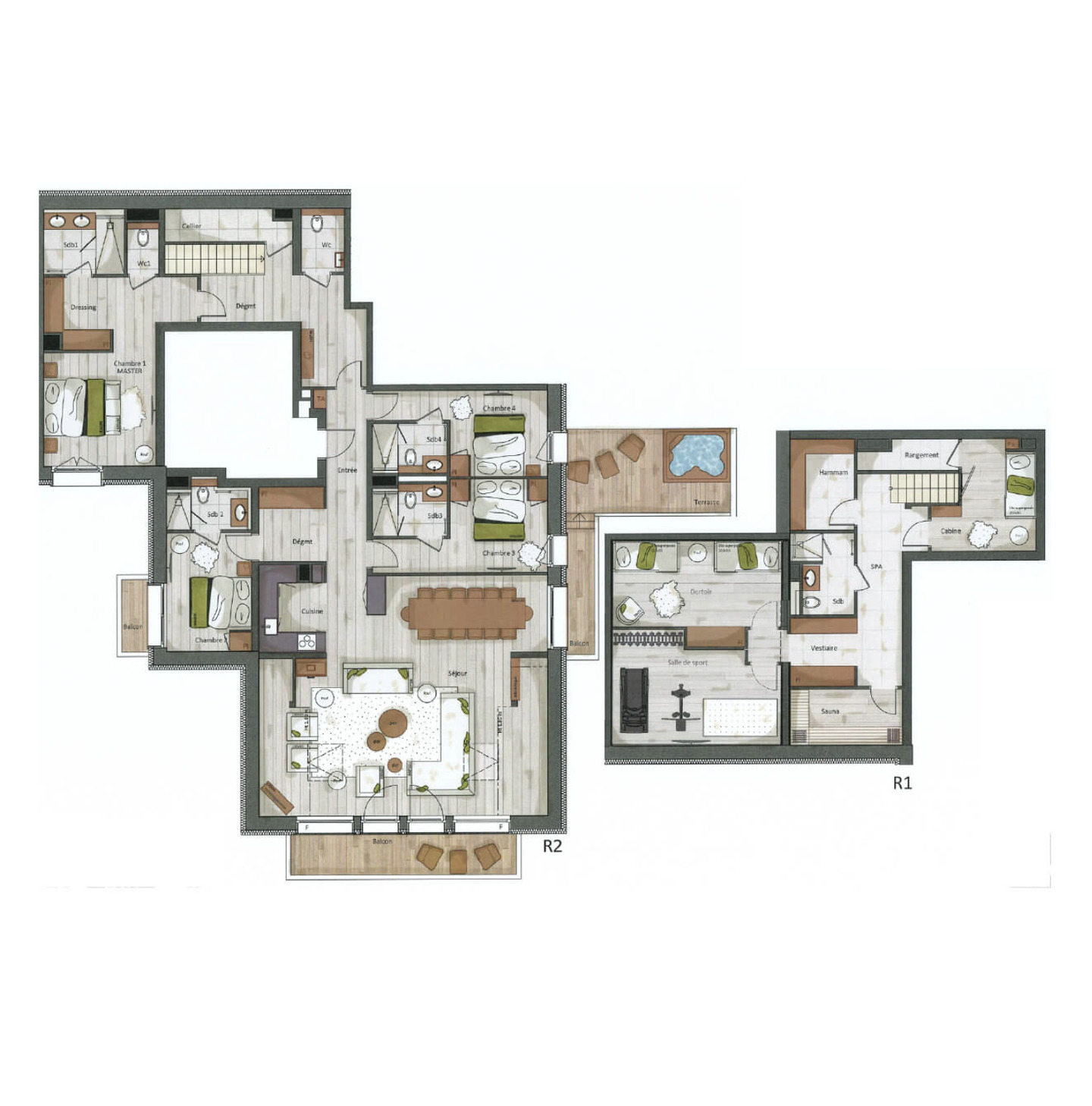 Исключительный двухуровневый дуплекс Проведите незабываемый отпуск в великолепном дуплексе площадью 264 м², расположенном на 2-м и 3-м этажах эксклюзивной резиденции Falcon. Это пространство, рассчитанное на 8 человек, сочетает в себе уют альпийского шале и современный шик.