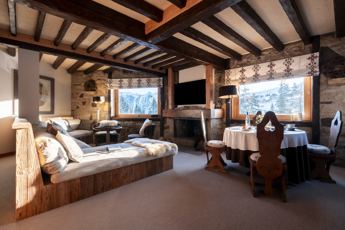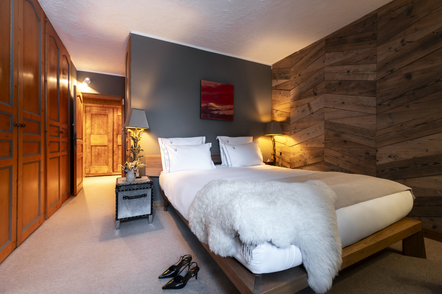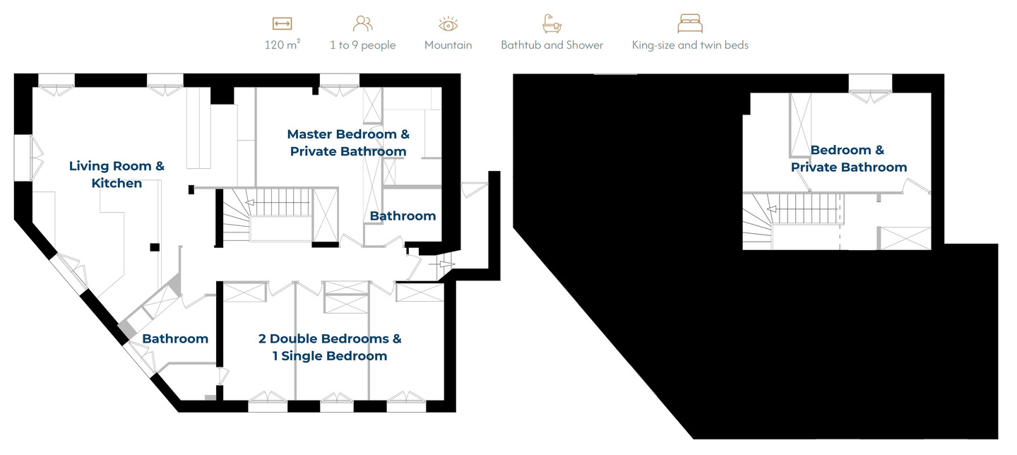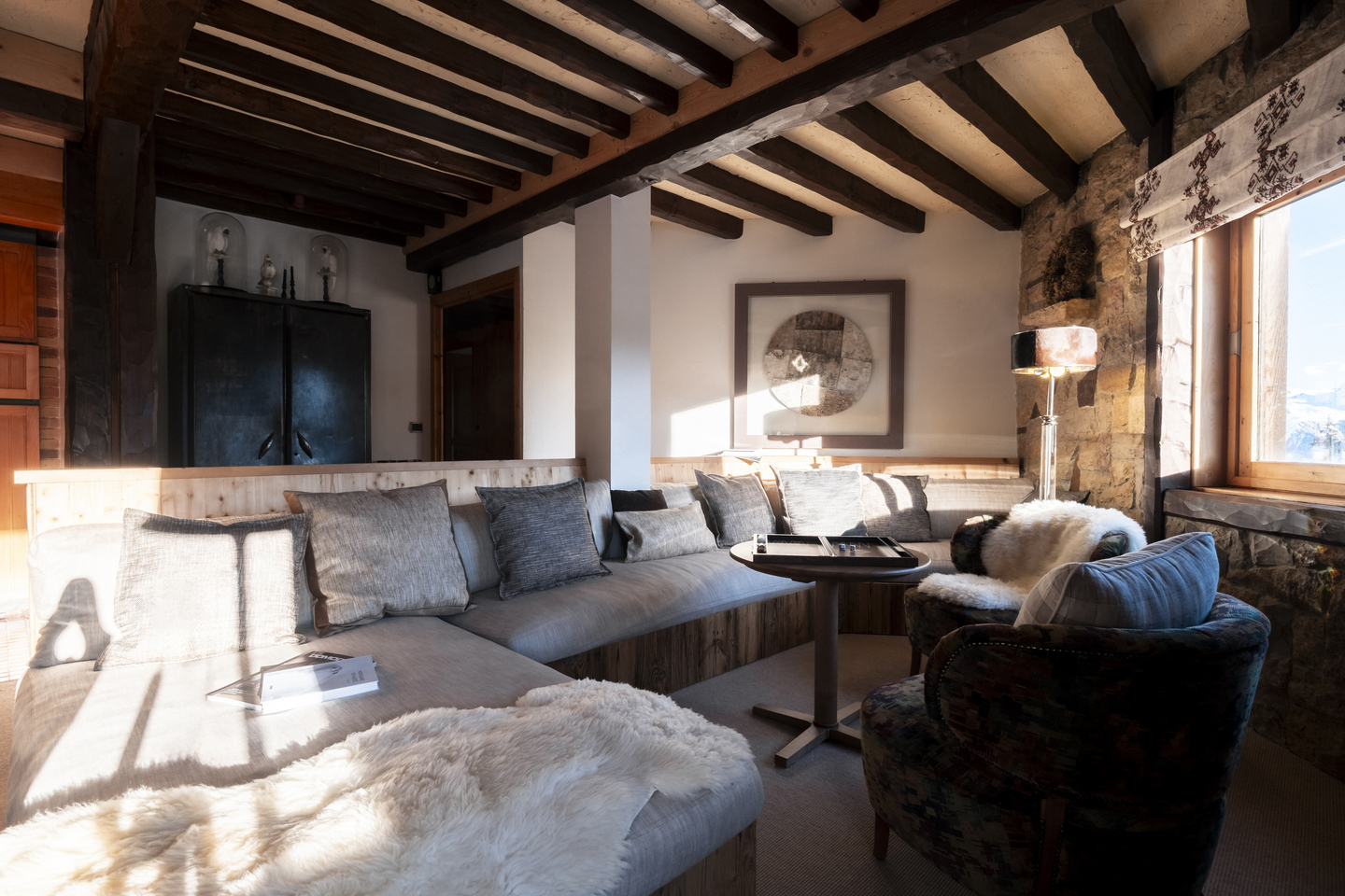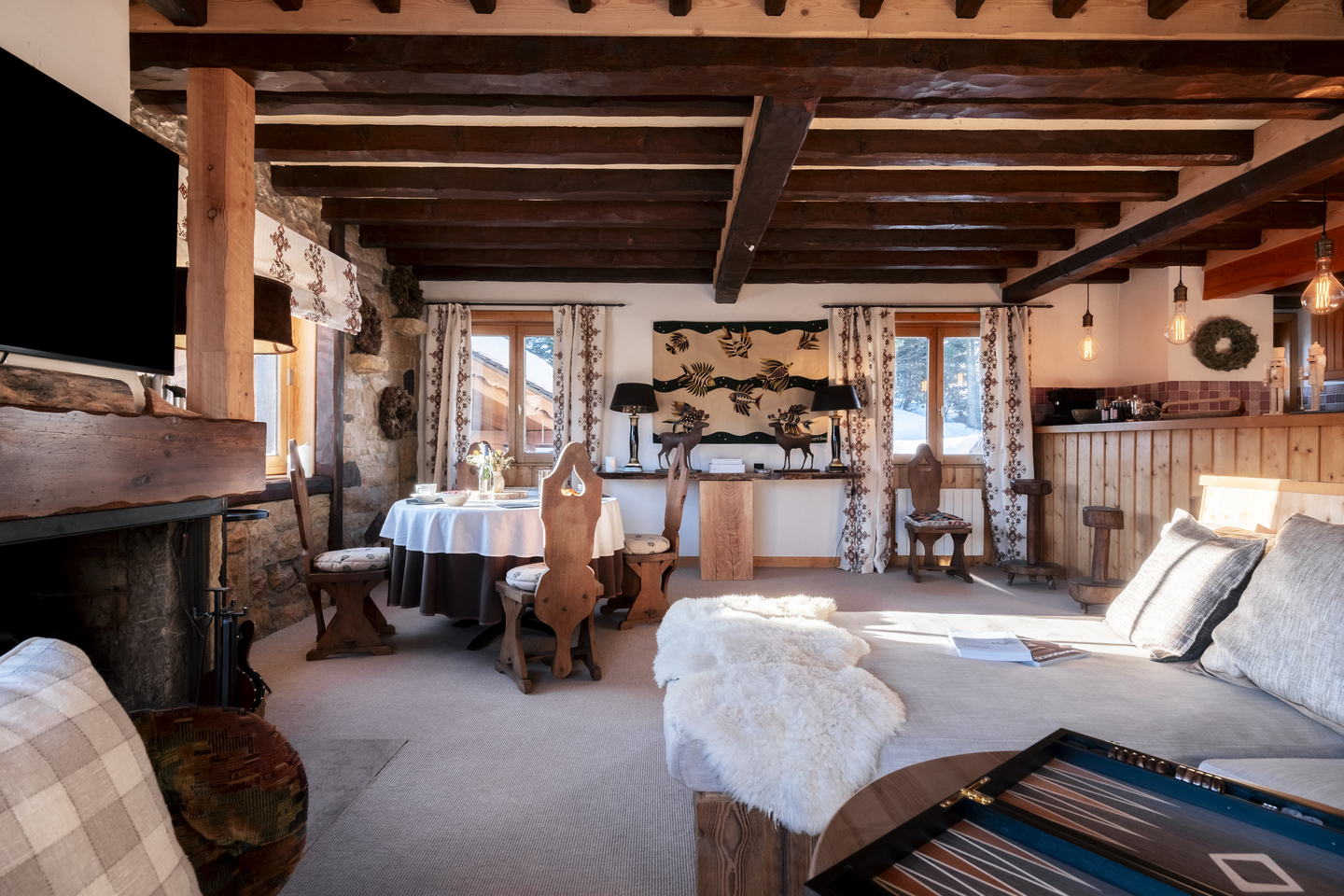 Шале распределено на пять спален и четыре полные ванные комнаты, расположенные на двух этажах. Включает просторную гостиную и отдельный туалет.
